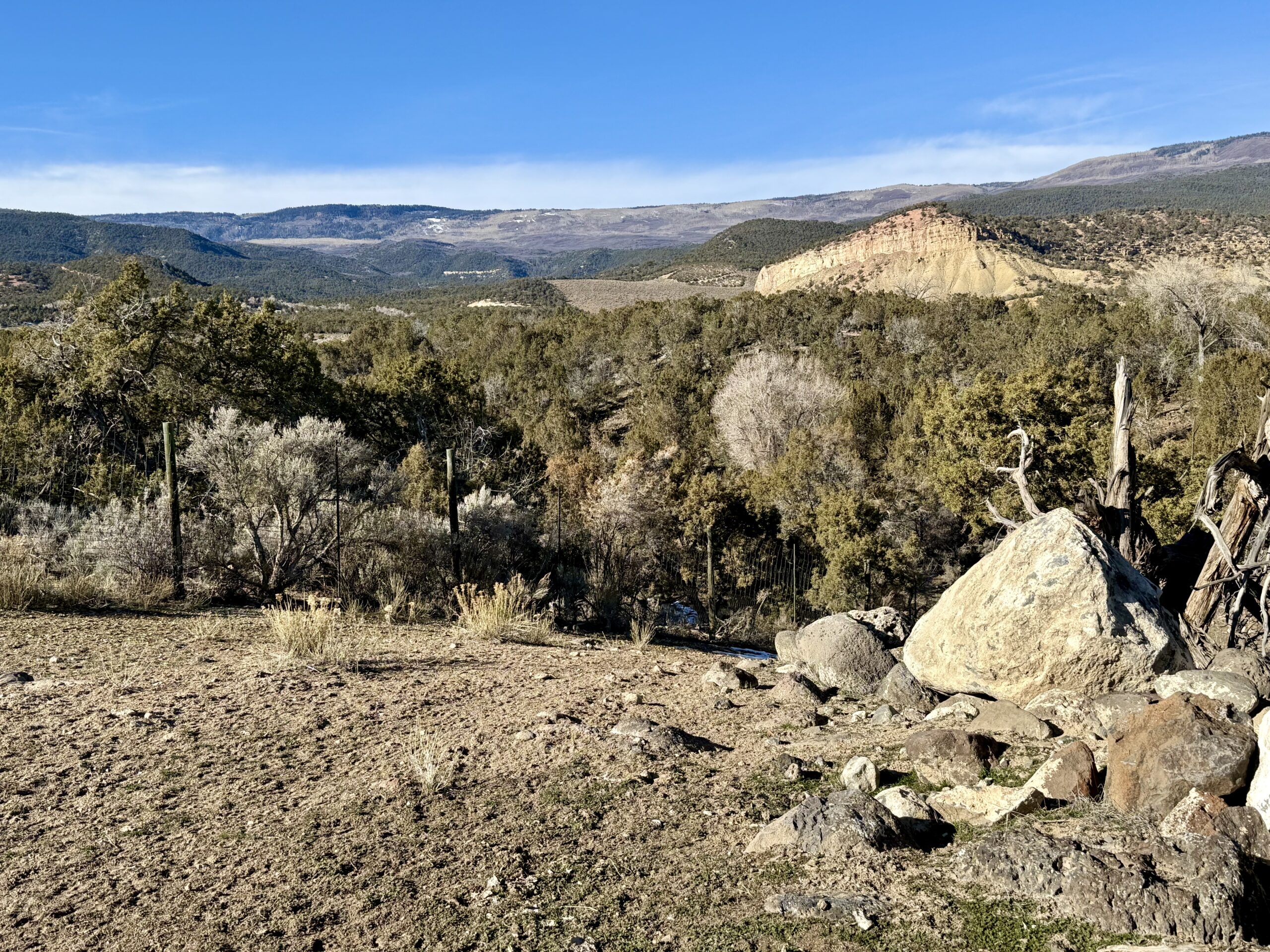 Property is under a fairly lenient conservation easement but does allow for one 5 acre residential building envelope. Property is high fenced. Gorgeous views of the Grand Mesa, West Elks, and San Juans.
